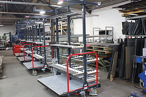 - Optionale Anpassung der Abmessungen, der Art der Stellflächenabdeckung sowie der Ausführung der Räder